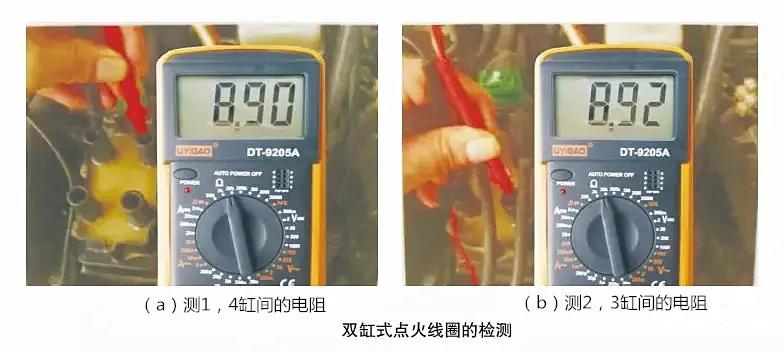 用万用表测量点火线圈的初级绕组、次级绕组以及附加电阻的电阻值,应符合技术标准,否则说明有故障,应予以更换。