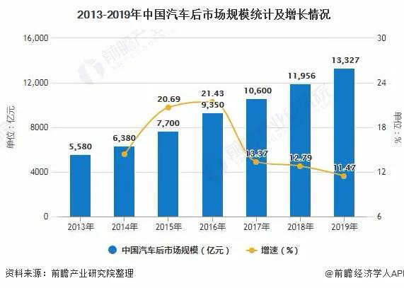 得益于我国汽车保有量的上升,产生了巨大的维修保养、汽车美容、汽车保险、汽车用品等多元化服务需求。根据中国汽车流通协会数据,2013年-2019年,我国汽车后市场行业市场规模逐年增加。